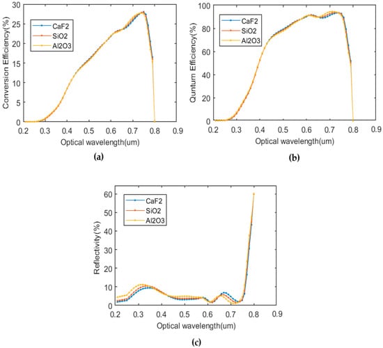 Figure 10a–c illustrates the total conversion efficiency, quantum efficiency and reflection in the inverted planar PSC with three anti-reflective coatings, respectively. Accordingly, the total conversion efficiency of a solar cell with an anti-reflective coating of CaF2 is greater than that with the anti-reflective coatings of SiO2 and Al2O3. According to Figure 10c, this result can be attributed to the trapping of photons in each of the three anti-reflection coatings of the inverted planar PSC.