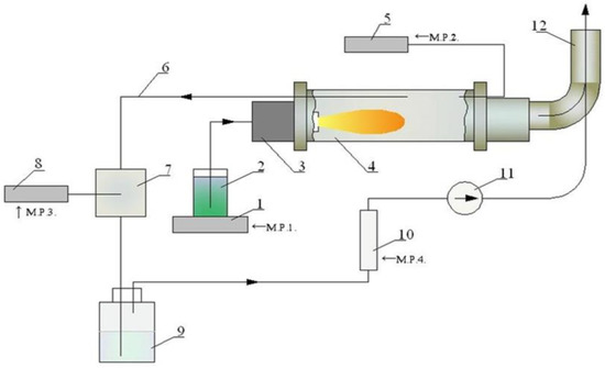 Experimental setup: (1) fuel consumption measuring device; (2) burette; (3) burner; (4) rotary kiln; (5) temperature indicator; (6) partial flue gas flow; (7) smoke analysis bottle; (8) smoke analyser; (9) flue gas washing bottle; (10) flue gas flow meter; (11) pump; (12) exhaust pipe; (M.P.1.); fuel consumption; (M.P.2.); flue gas temperature in the rotary kiln; (M.P.3.); flue gas analysis (O2, CO, CO2, NO, t); (M.P.4.); flue gas volumetric flow rate.