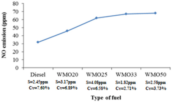 Variations in NO emissions from diesel fuel combustion, WMO-diesel fuel blends are shown in Figure 3. It can be observed that NO emissions for WMO diesel mixtures are higher than NO emissions from diesel combustion. Higher NO emissions are the consequence of higher gas temperatures in a rotary kiln for mixtures than the gas temperature generated by combustion of diesel. Compared to diesel fuel, by burning fuel WMO50, the flue gas temperature in the rotary kiln increased by about 22%. Most literature data such as [1,6,19] show a slight increase in NO by burning mixtures of waste oils and diesel fuels in internal combustion engines.