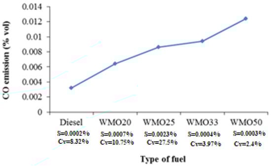 Variations of CO emission during combustion of a mixture of WMO with diesel fuel and diesel are shown in Figure 4. CO emissions for WMO diesel fuel mixtures are significantly higher than diesel combustion emissions. The CO emission for diesel fuel was 0.0032%, and for blends WMO20, WMO25, WMO33 and WMO50, was 0.0064%, 0.0086%, 0.0094% and 0.0124%, respectively. The CO emissions for WMO and its mixtures are higher because of poor mixture formation due to less oxygen in the chamber for combustion. In the cited literature [1,6,19] an increase in CO for all types of tested fuels can be found.