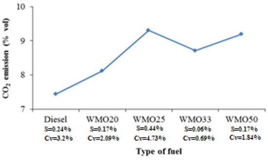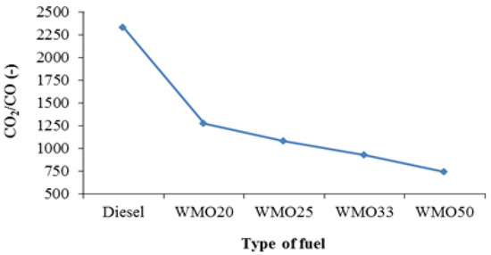 Combustion of WMO and its diesel blends recorded CO2 emissions in the interval of 8.12% to 9.20% for WMO20 and WMO50, respectively. CO2 emissions for diesel WMO blends are slightly higher than diesel combustion emissions of 7.44% (Figure 5). In the flue gas relative to the volume fraction of CO for all types of combustion, the CO2:CO ratio indicates lower CO2 concentrations for WMO-diesel blends compared to diesel. For combustion of WMO50, CO2:CO = 0.74·103:1, and for combustion of diesel, CO2:CO = 2.32 × 103:1; they are as expected (Figure 6).