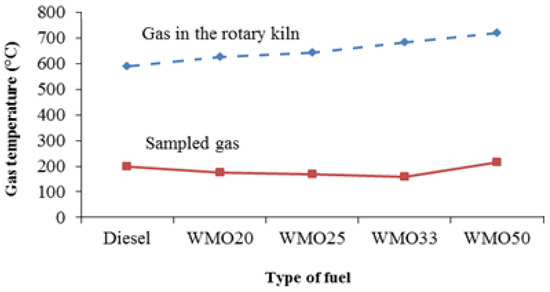 The flue gas temperature in the rotary kiln ranged from 589 °C to 719 °C, and the exchange temperature (gas sampling temperature) ranged from 157 °C to 214 °C. We measured higher flue gas temperatures in the case of mixing WMO with diesel fuel compared to diesel fuel with higher WMO density results, and WMO measurement was higher than diesel density, resulting in higher heat release rates (Figure 5).