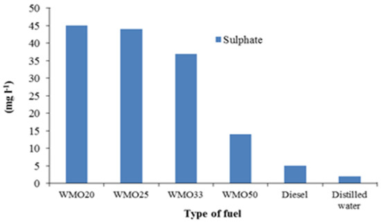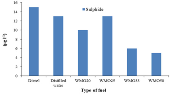 Figure 9 shows a decrease in the sulphide in the flush when combusting WMO and its mixtures with respect to diesel. The highest concentrations of sulphide in diesel and distilled water are expected given the physical and chemical properties of diesel and distilled water.
