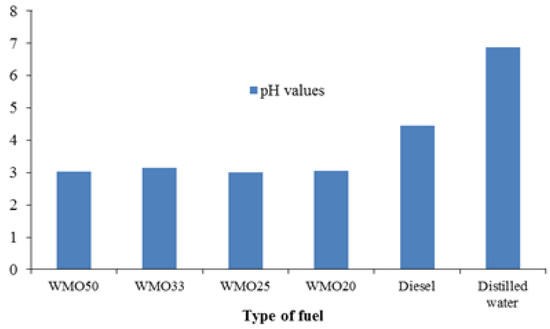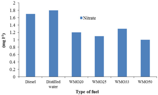 The highest nitrite concentration of 0.19 mgL−1 was observed when using diesel and was 6.33 times higher than the allowed value of 0.03 mgL−1 [21]. The concentration of nitrite when using WMO and its blends with diesel is within the permissible limits of Figure 11.