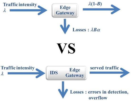 Consider the edge nodes equipped by an IDS. It is reasonable to assume that part of the malicious requests will be rejected and the novel workload intensity will be reduced ( On the other hand, it does not guarantee that the system throughput will improve. IoT devices need to perform additional operations for intrusion detection, system maintenance, and malicious request filtering. Therefore, the performance of the request treatment needs to be reduced, i.e., the novel intensity of the request treatment becomes , and A signature-based IDS can be used if the security system is designed to counteract a limited set of known attacks. In this case, the IDS uses a set of rules (signatures) that can detect the presence of an attack pattern. This provides a high level of accuracy for well-known intrusions. A signature-based IDS is usually characterized by low computational cost ( The same effect can be reached using a small number of secret bits for requests verification. On the other hand, this situation is not typical for IoT environments. Hands-on experience has shown that attackers often change their hacking tactics and develop new intrusion approaches and instruments. Signature-based detection does not detect slightly modified attacks; much less, it does not detect unknown attacks. Hence, advanced intrusion detection methods must be applied. Furthermore, is not typical for the IoT considering the edge devices level [23]. Low resources render heavy computation algorithms, such as deep learning, ineffective. Therefore, it is reasonable to assume that the performance of a requested treatment did not increase drastically. Moreover, some legitimate requests are mistakenly recognized as illegal and are filtered by an IDS.