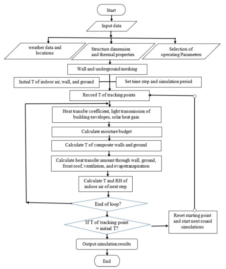 As shown in Figure 1, the simulation process starts with the input of basic simulation conditions, including the location and weather conditions, physical and thermal properties of greenhouse structural materials, and operation schedule. Based on the input parameters, the model starts calculating the indoor thermal field for the next simulation step and recording each step’s thermal parameters. When the simulation process comes to the final moment, the model compares the specified tracking point’s temperature to the corresponding initial temperature and replaces the initial temperature with the predicted final temperature. After several simulation cycles, the fluctuation in indoor thermal parameters comes within the acceptable range (10−5, and the model will output the simulation results.