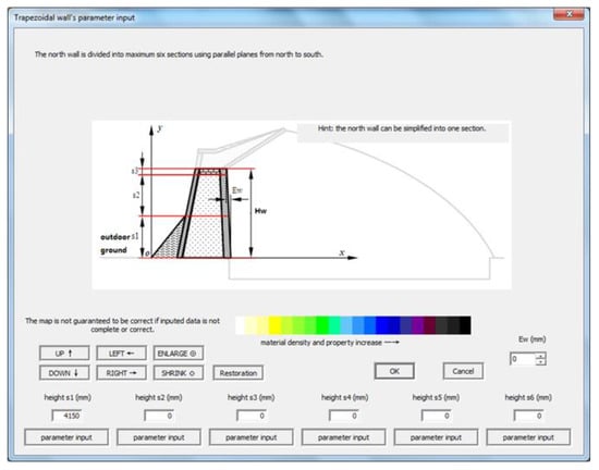 The next step is to define the physical and thermal properties of constructional materials for the greenhouse. The dimensions and building materials are set for the north roof, north wall, and floor. As shown in Figure 3 and Figure 4, users input the segment lengths in the north wall and the building material’s thermal properties, including density, thermal conductivity, and specific heat. The model also has a built-in material library that facilitates users to find commonly used materials. Figure 4 shows the interface of the greenhouse’s detailed physical and thermal properties.