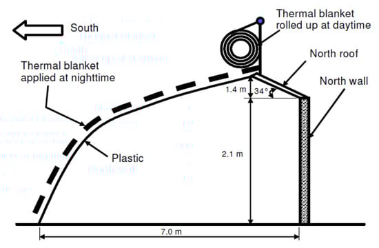 A commercial solar greenhouse located in Elie, Manitoba (49°55′ N, 97°28′ W) was used for validation of the SOGREEN model. The greenhouse has the classic structure of mono-slope CSGs (Figure 5). Three days of measurement data (28 to 30 March 2017) by Ahamed et al. [] were obtained to validate the model. The greenhouse is 28 m in length and 6.7 m in width. The north wall and ridge heights are 2.1 m and 3.5 m, respectively, and 34° is the angle between the north roof and the horizontal plane. The south roof is covered with a 6-mil single-layer polyethylene film, while the cotton thermal blanket (RSI-1.2) covers the south roof from the outside at night. The north wall is made of wooden stud wall; from outside to inside are corrugated galvanized sheet steel (2 mm), fiberglass insulation (152 mm), plywood (13 mm), sand (152 mm), and corrugated galvanized steel (2 mm). A portion of the north wall interior surface was painted black to absorb solar energy. The north roof is made of corrugated galvanized sheet steel (2 mm), fiberglass insulation (152 mm), plywood (13 mm), and plastic film from inside []. Table 1 lists the thermal properties of the materials for the north wall, sidewall, and north roof obtained from the ASHRAE standards [].