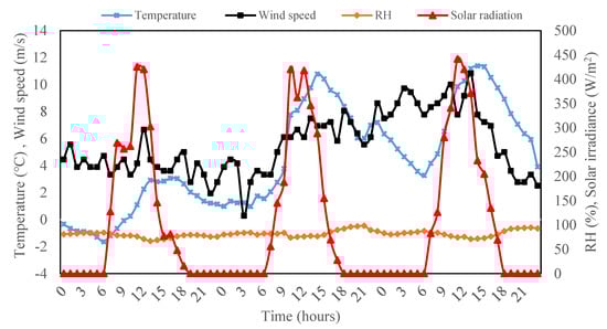 The height of the newly transplanted tomato plants was about 14 cm during the experiment. The distance between tomato plants was about 31 cm, and the space between the north wall and the bed was 96 cm. The outdoor temperature ranged from −2.0 °C at night and 10.0 °C at noon (Figure 6). An electrical heater (3.6 kW) controlled by a thermostat was used to heat the greenhouse when the indoor temperature dropped below 12 °C, and the heater turned off when the temperature reached 18 °C. The cotton thermal blanket was rolled down to cover the south roof before the sunset at 5:30 p.m. and rolled up to uncover the roof after the sunrise at around 7:00 a.m. The vent was opened manually to reduce the indoor air temperature at noon when the indoor temperature was very high. For validation, the air exchange by infiltration (0.156 m3/s) was considered most of the time (2:30 p.m. to 11:00 a.m.) because no intentional ventilation was allowed to the greenhouse. The vent was typically opened between 11:00 a.m. to 2:00 p.m. and the air exchange by ventilation was estimated at 0.52 m3/s. A detailed description of the experimental setup can be found in Ahamed et al. [].