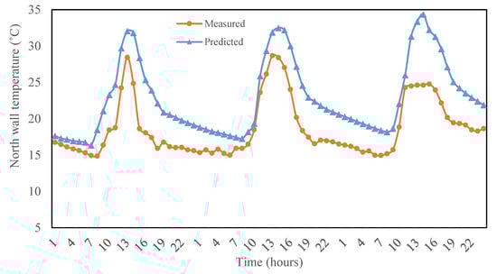 Figure 8 shows the comparison of the measured and predicted temperatures for the north wall surface. In general, the diurnal profiles have a similar trend, but the predicted values are higher than measured ones with an average discrepancy of 4.2 °C and the highest difference of 9.7 °C. The discrepancy could mainly be caused by possibly large discrepancies of the actual values of the thermal properties of the wall materials (sheet steel, sand (wetness), wood stud, etc.) with the book values selected for the model. Furthermore, the model is limited in defining the sheet metal’s corrugated shape (larger surface area), so it uses a flat surface instead. With some modifications of the thermal properties, the model predictions could be improved, although this study did not do so in order to stick to the original book values.