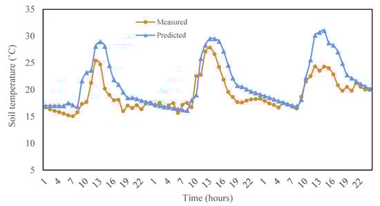 Figure 9 shows that the predicted soil surface temperature typically followed a similar pattern with higher daytime predictions than measured values, while at night, the two are very close except when the electric resistance cable heater was in operation for the third night, which the model did not consider. The average discrepancy between predictions and measured values is 2.3 °C, and the maximum is 7.9 °C.