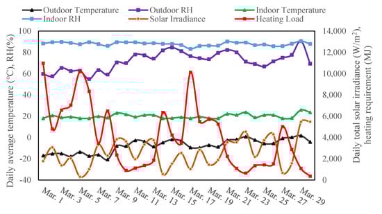 Daily average indoor conditions, solar irradiance, and heating loads in March.