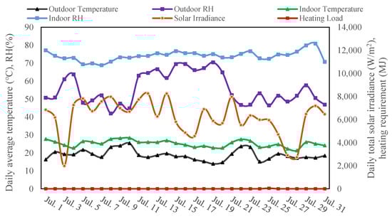 Daily average indoor conditions, solar irradiance, and heating loads in the study greenhouse in July.
