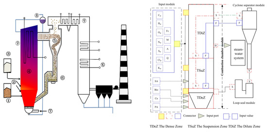 With its unique advantages of fuel flexibility, low NOx emissions and high sulfur capture efficiency, the circulating fluidized bed (CFB) technology is expected to continue to be one of the main furnace types for biomass direct-fired power generation units in the future [10]. However, the biomass burned in the furnace generally has the characteristics of variable fuel types, high moisture content, high volatile fraction, high alkali metal and chlorine content, and low calorific value [11]. In particular, the variation of fuel type and quality will cause drastic changes in combustion process variables (such as the furnace temperature, main steam pressure and temperature, flue gas composition, emission pollutants, etc.). This easily leads to combustion instability, heating surface corrosion and slagging, and even bed material agglomeration causing fluidization state failure. It brings serious challenges to the safe and stable operation of the generation units and low pollutant emission. A thorough understanding of the dynamic characteristics of CFB boilers is the basis of operation optimization and parameter adjustment. However, due to the restriction of the safe operation and test costs of power plant units, modeling simulation has become an important tool to study the characteristics of power plant systems.