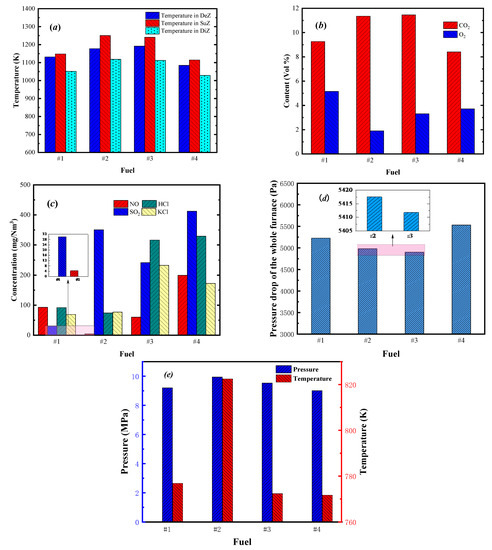 After the system is stable, the furnace temperature distribution is shown in Figure 2a. It can be seen that the temperature corresponding to the combustion of the biomass fuel pine was generally higher than that of other fuels, and the temperature difference in the suspension zone was more obvious. The reason may be that the combustion of fuel is mainly concentrated in the suspension zone. Figure 2b shows the output results of CO2 and O2 volume fraction in the flue gas when the four fuels are burned separately. Combined with Figure 2a, it can be seen that the CO2 and O2 volume fractions are closely related to the furnace chamber temperature. The (#2) fuel is burned with a high chamber temperature, high CO2 concentration in the flue gas, and a low oxygen content. It can be seen from Figure 2c that the concentrations of NO, HCl, and SO2 in the flue gas generated by the combustion of pure corn stalk (#4) were the highest. There were 199.47 mg/Nm3, 329.30 mg/Nm3 and 412.42 mg/Nm3, respectively. The concentration of KCl in the flue gas generated by the combustion of the cotton stalk (#3) was the highest, up to 232.56 mg/Nm3. The SO2 generated by the pine (#2) combustion was as high as 350.56 mg/Nm3. Combined with Table 3, the SO2 in the flue gas generated by burning the fuel with more sulfur elements was high, and the transformation of the NO from the cotton stalk to corn stalk has the opposite change. This is because the generation of NO is not only related to the nitrogen content of fuel, but also related to temperature, fuel combustion state, and combustion atmosphere in the furnace. When burning pure corn stalk (#4), the pressure dropped corresponding to the whole furnace pressure drop was the largest, which was 5966 Pa (Figure 2d). Figure 2e shows the comparison of the main steam pressure and the main steam temperature for the four fuels. The main steam pressure and the main steam temperature were corresponding to the furnace temperature. When the pine (#2) was used as fuel, the main steam pressure and temperature were higher than those of the other three fuels. The change of fuel has a more obvious effect on the main steam temperature.