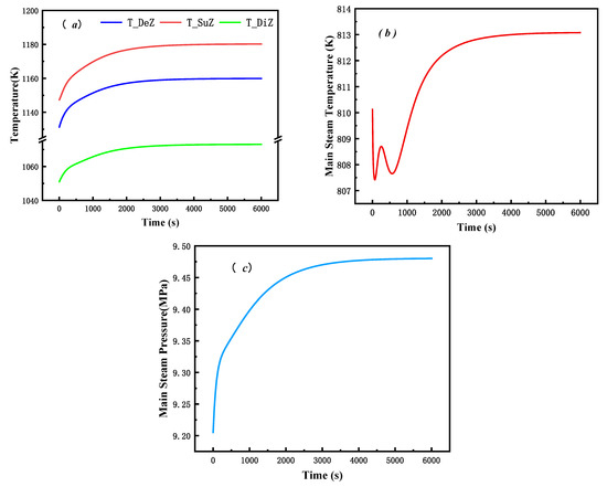 The changes of the main steam pressure and temperature were consistent with the changes of the furnace temperature (Figure 4f). In the dynamic process, the maximum main steam pressure was 10.42 MPa, and the maximum main steam temperature was 862 K. With the increase of temperature, the outlet flow of the evaporation zone would increase. The fluctuation of the main steam temperature is the result of the combined effect of the flue gas temperature and superheater inlet flow.