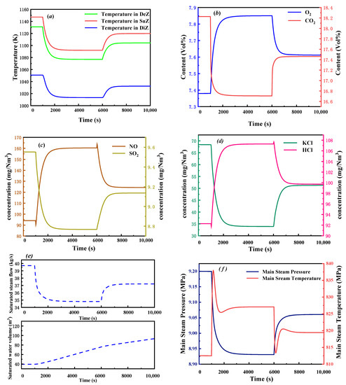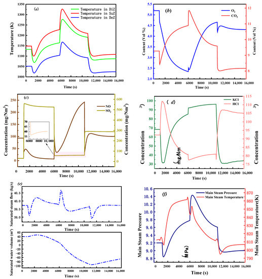 (a) Furnace temperature response (b) O2, CO2 response (c) NO, SO2 response (d) KCl, HCl response (e) Saturated steam flow and saturated water volume response (f) Main steam pressure and temperature response.