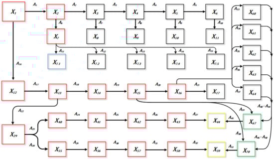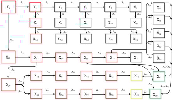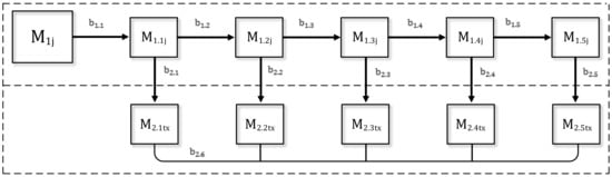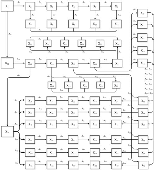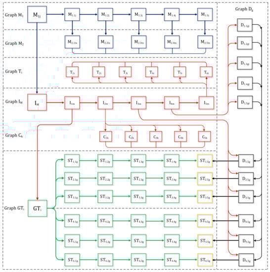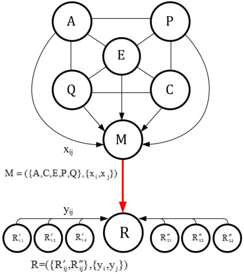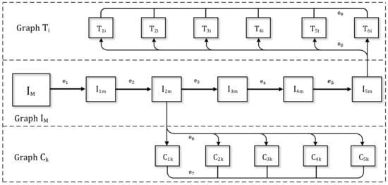 Let us represent the set of possible options for the implementation of the effects of a cyberattack on the TDTN in the form of a concatenation of the graph (set of cyberattacks) and the graph (set of PIRs), as shown in Figure 3.