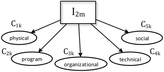 In the context diagram presented in Figure 3, the vertex is composed of vectors of the information and technical impact , as well as the information and psychological impact on the TDTN. Here is the vector of the set of indicators of software and technical espionage (intelligence) in relation to the TDTN and protected resources, is the vector of the set of indicators of passive (providing) cyberattacks, is the vector of the set of indicators of active cyberattacks on the TDTN resources (destruction, manipulation, blocking, substitution, and so on), is the vector of the set of indicators of information tools and methods of influencing the personnel of the TDTN, and is the vector of the set of indicators of the psychotronic and cognitive impact on the personnel of the TDTN. In the future, we will not consider the information-psychological impacts (vectors and ), taking into account that for the SG this area of impacts refers to the limitations.