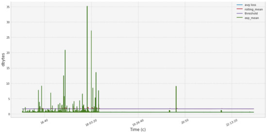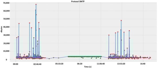 In order to determine the dependence of the cyberattack detection time on the volume of analyzed data, several experiments were carried out using the proposed method for two additional datasets. They differ from the base one, containing, as mentioned above, 82,332 records. The first additional dataset contained about 164,000 (i.e., it was about two times larger than the baseline). The second additional dataset contained approximately 41,000 records (i.e., it was about two times smaller than the base one). The experiments have shown that for the first additional dataset, the average attack detection time was 1150 ms, and for the second—150 ms. Thus, the dependence of the time to detect attacks on the volume of analyzed data has a power-law character with a low exponent. The dependence of the system response time on the amount of processed data is presented in Figure 37.