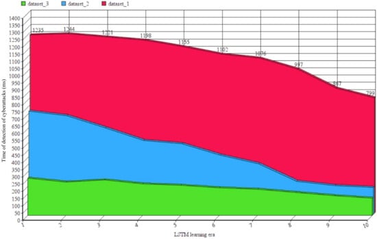 Figure 37 discusses 3 datasets and 10 neural network learning eras. The Y axis corresponds to the response time of the system (i.e., the cyberattack detection time). The graph has three different dependences that show that the cyberattack detection time is reduced with each learning era. However, additional computing power is required to ensure the model scalability.