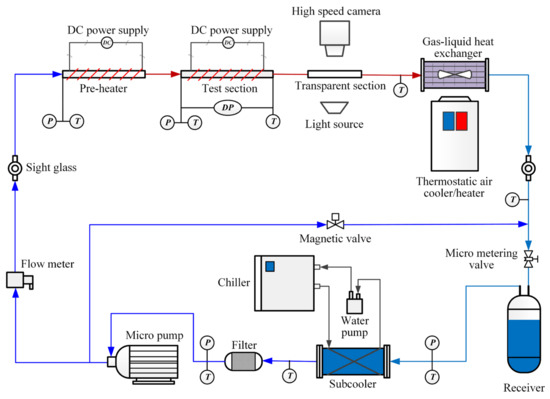 The refrigerant loop is mainly composed of a pump, pre-heater, test section, gas-liquid heat exchanger, and receiver. The liquid refrigerant from the receiver transfers heat to the cold water generated by the chiller in the subcooler. After passing through the filter, micro-gear pump, and volumetric flow meter, the subcooled refrigerant flows into the pre-heater where it is heated to two-phase state via the enameled heating wire. The two-phase refrigerant, with a certain vapor quality, flows into the test section and then is heated to a pre-defined exit vapor quality via the same electrical heating method. Then, the refrigerant flows into the gas–liquid heat exchanger and then is cooled or heated by the regulated air generated by the thermostatic air cooler/heater. Finally, the refrigerant passes through the micro metering valve and returns to the receiver. Additionally, a flow branch connects the outlet of the pump and inlet of the micro metering valve, and is controlled through the magnetic valve.