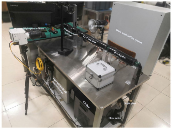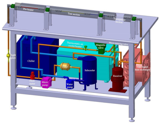 The experimental system schematic regrading to R1234ze(E) flow boiling is presented in Figure 1. The refrigerant, water, and air flow were in three different loops separately, among which the water loop was applied to regulate the refrigerant temperature, and the air loop was utilized to adjust the refrigerant pressure. The 3D model and photograph of the established experimental system are shown in Figure 2 and Figure 3.