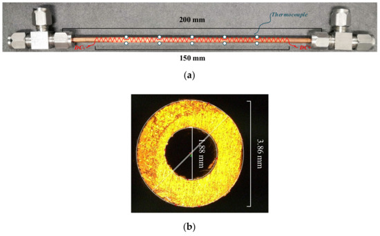 The test section is a 200 mm long horizontal circular cooper tube. Its inner diameter (D) and outer diameter (Do) are 1.88 and 3.86 mm, which were measured by a high-precision optical microscope with an accuracy of 1 µm, as shown in Figure 4. Its outer wall temperature was measured by uniformly spaced thermocouples fixed on the top and bottom locations with calibrated accuracies of 0.1 °C. Its pressure drop was obtained through a differential gauge connected to the inlet and outlet with an accuracy of ±0.075%FS (0–100 kPa). The transparent section is a transparent polytetrafluoroethylene tube having a length of 100 mm. and is connected with cooper tubes with specially-made joints to avoid refrigerant leakage. The thermophysical properties of the working fluid R1234ze(E) under specific saturation pressures are listed in Table 1.