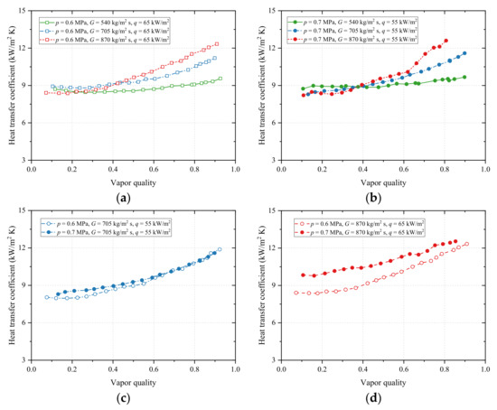The variation of HTC with saturation pressure is illustrated in Figure 5c,d. Obviously, the larger the saturation pressure is, the larger the HTC is. Moreover, the effect of saturation pressure is more significant at lower vapor quality. For instance, when G = 705 kg/m2 s, and q = 55 kW/m2, HTCs related to psat = 0.6, and 0.7 MPa are similar for x > 0.6, as shown in Figure 5c. On the one hand, this is because of the faster formation rate of bubbles at higher saturation pressure, leading to the nucleate boiling more intense. For another, the saturation pressure variation brings about the refrigerant thermophysical properties variation, affecting HTC through the coupling change of the surface tension and the vapor-liquid density ratio. A similar trend was also found by Vakili-Farahani et al. [17]
