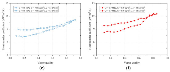 Flow boiling HTC of R1234ze(E) versus vapor quality: (a) effect of mass flux on HTC at p = 0.6 MPa and q = 65 kW/m2; (b) effect of mass flux on HTC at p = 0.7 MPa and q = 55 kW/m2; (c) effect of saturation pressure on HTC at G = 705 kg/m2 s and q = 55 kW/m2; (d) effect of saturation pressure on HTC at G = 870 kg/m2 s and q = 65 kW/m2; (e) effect of heat flux on HTC at p = 0.6 MPa and G = 705 kg/m2 s; (f) effect of mass flux on HTC at p = 0.7 MPa and G = 870 kg/m2 s.