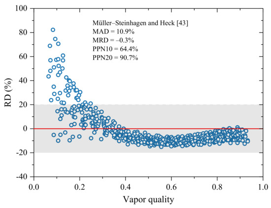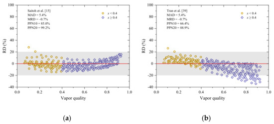 With the 253 measured HTC data points, twelve existing correlations of two-phase HTC recommended by Xu et al. [31] are compared, including those of Fang [32], Wattelet et al. [33], Gungor and Winterton [34], Shah [35], Saitoh et al. [15], Sun and Mishima [8], Liu and Winterton [36], Jung et al. [37], Bertsch et al. [9], Li and Wu [38], Tran et al. [39], and Cooper [40]. The comparison results are summarized in Table 3, where MAD and MRD represent the mean absolute deviation and the mean relative deviation, and PPN10 and PPN20 mean the percentages of the data points having the relative deviation (RD) within ±10% and ±20%.