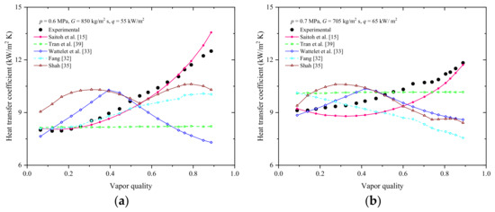 Comparison of HTC trends based on predictive correlations and measured data: (a) p = 0.6 MPa, G = 850 kg/m2 s and q = 55 kW/m2; (b) p = 0.7 MPa, G = 705 kg/m2 s and q = 65 kW/m2.