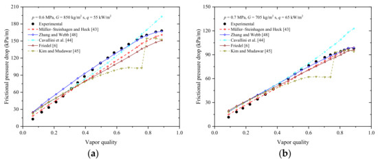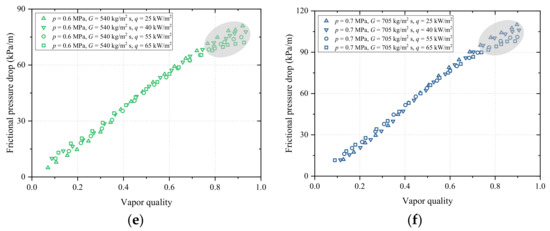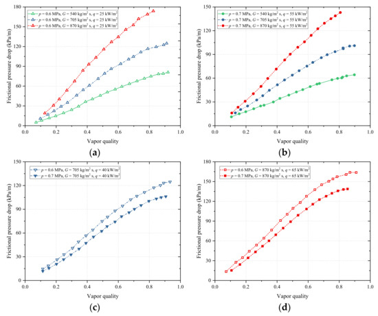The relation between FPD and saturation pressure is illustrated in Figure 8c,d. FPD presents diminution for greater saturation pressure. For instance, when G = 870 kg/m2 s, and q = 65 kW/m2, FPDs of psat = 0.6 and 0.7 MPa are 127.79, and 108.38 kPa/m for x nearby 0.60, as shown in Figure 8d. This is because of the refrigerant property change. Specifically, the decrease of saturation pressure brings about the increase of vapor velocity due to the reduction of vapor viscosity and density, as well as the increase of liquid viscosity, yielding the increase of FPD.