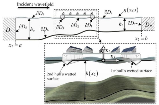 On the other hand, although several solar farms have been developed on closed water basins, such as lakes, reservoirs and dams, implementing installations in the open sea is a challenging task, as their interaction with several environmental factors is not yet fully understood []. In the offshore and nearshore region, safety and viability require the design and construction of resilient FPV structures that can withstand the harsh marine environment. Regarding the deployment of floating structures of relatively large dimensions in nearshore and coastal areas, it is also expected that bathymetric variations will have significant effects on their responses under wave loads, which also affect the performance of the power output due to oscillatory motions of the structure and the panels arranged on the deck. Stability requirements, in conjunction with a lightweight structure with a center of gravity at a relatively increased height above the keel, led to the consideration of a twin hull structure with a more complicated response pattern and resonance characteristics. In this study, a hydrodynamic model is developed to predict the dynamic responses of a floating structure supporting photovoltaic panels on a deck while being subject to wave loads. For the treatment of complicated resonance phenomena, as well as the effects of finite and possibly variable bathymetry, which characterizes nearshore and coastal regions, a general model based on boundary element methods (BEM) is developed, which is capable of modeling the involved phenomena. The model is then systematically applied in selected examples to produce preliminary results, which are illustrative of the effect of dynamic motions on the energy efficiency of a floating unit.