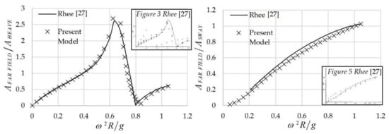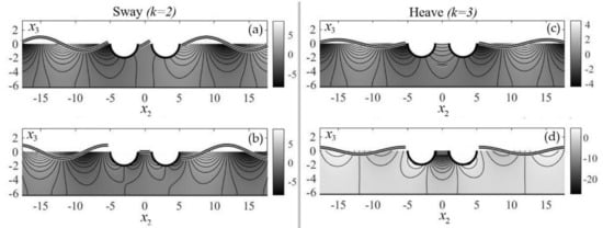 Figure 2 illustrates the aforementioned ratio regarding the heave and sway motions in the case of unit amplitude of the twin-hull structure. The wetted surface of each hull is semicircle of radius R in the plane, while each of the two semicircles’ centers are at a distance P from the origin, following the notation of Rhee []. Therefore, the two centers are at a distance 2P apart and the configuration is defined so that . The results concern the radiation fields that propagate in deep water, which is achieved in the present numerical model by setting the depth as a constant and equal to half the wavelength, for each simulated frequency, as calculated from the dispersion relation for deep-water .