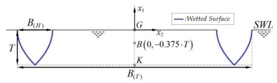 which also refers to the unit length in the transverse direction . Finally, the metacentric height was calculated as , where K is a reference point with coordinates . The above equations can also be modified to include other external forces, as e.g., mooring forces or spring terms (see, e.g., Section 3.5 of []). The solution of the above system (13) provides us with the complex amplitudes of the corresponding motions of the twin hull: . Then, the total wave potential is obtained using Equation (4), from which the hydrodynamic pressure is obtained using Bernoulli’s theorem. The wave loads on the floating structure are calculated using pressure integration on the wetted surface .