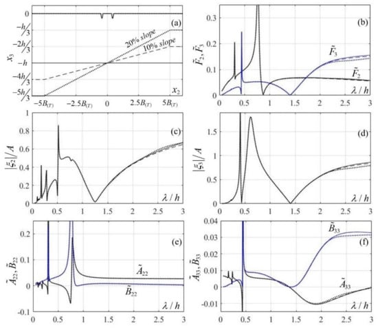 Numerical results are presented in Figure 6 and Figure 7 concerning the hydrodynamic behavior of this floating structure in constant depth and over two linear shoals characterized by (constant) bottom slopes of 10 and 20%, respectively (see Figure 6a). The shoaling environments were achieved using a linear depth reduction of and respectively, over a depth variation distance of , with the mean water depth of all three domains of transmission being equal to . The results concerning the homogeneous domain were plotted using solid lines, while the results concerning the inhomogeneous transmission domains with bottom slopes of 10 and 20% were plotted using dashed lines and dotted lines, respectively.