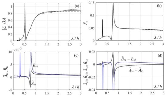 In particular, Figure 6b illustrates the normalized hydrodynamic forces as functions of the non-dimensional wavelength for all three considered domains of transmission, where is the wavelength corresponding to the mean water depth , as obtained through application of the dispersion relation: The normalization used for the hydrodynamic forces is where is the incident wave amplitude.