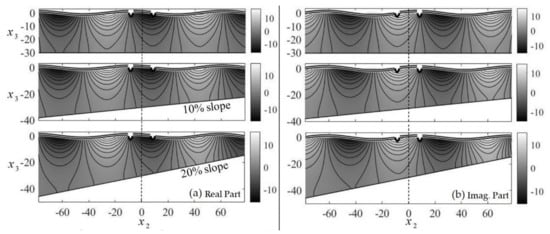 Finally, indicative results regarding the total induced wavefields are depicted in Figure 8 for non-dimensional wavelength equal to . In particular, Figure 8a illustrates the real part of the total potential ; see Equation (4) for the three considered cases of 0, 10 and 20% bottom slope (see Figure 6a) in the general vicinity of the floating twin-hull structure. Figure 8b depicts the imaginary parts of the corresponding potential functions. The configuration was made dimensional by setting and an incident field of amplitude has been considered. The alterations to the wavefields due to the non-uniform topography profiles are clearly seen, as the equipotential lines intersect each seabed boundary section perpendicularly, which implies the satisfaction of the impermeability boundary condition.