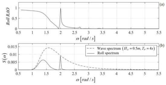 (a) Roll response of the floating twin-hull structure of breadth B = 20 m at a mean depth h = 30 m. (b) Incident wave spectrum (dashed line) and roll angle spectrum (solid line) of the structure in the case of incident waves with a significant wave height and a peak period .