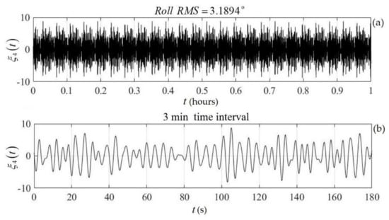 Simulated time series of the floating twin-hull structure’s roll motion. Total breadth at a depth in the case of incident waves with a significant wave height equal to and a peak period . (a) A 1 h long time series and (b) indicative roll motion over a 3 min long interval.