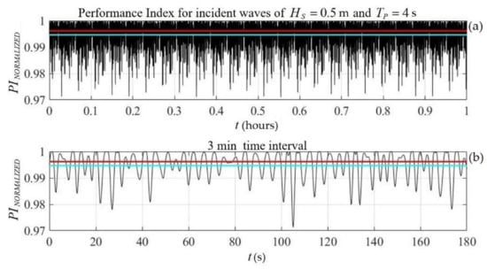 As an example, the numerical results concerning the calculated roll response of a floating twin-hull structure of breadth at depth with an incident wave spectrum (dashed line) and roll angle spectrum (solid line) of the structure in the case of incident waves of significant wave height and peak period are presented in Figure 9. Based on the calculated roll spectrum, the simulated time series of the roll motion of the above floating twin-hull structure for the considered coastal environment and incident waves are shown in Figure 10 for a time interval of 1 h. Furthermore, in the same figure, a representative small interval of 3 min was obtained using the random-phase model [,] for a sea state that was characterized by significant wave height and peak period , as generated by winds corresponding to the Beaufort scale levels . In this case, indicative results concerning the effect of waves and roll responses of the structure on the performance index are shown in Figure 11, as calculated by Equation (20) using a representative value of the mean angle of incidence and omitting, as a first approximation, the effect of diffuse and reflected irradiance components . The value of the performance index in calm water was . In the considered case of incident waves, which were characterized by a very low energy content, the value of the estimated performance index dropped to . The latter’s mean value, as well as the corresponding calm-water value, are shown in Figure 11 using cyan and red lines, respectively.