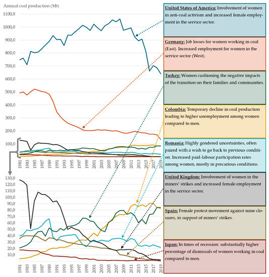 The 73 studies recorded in the systematic map covered gender aspects of coal transitions in eight countries: the USA, Colombia, Germany, Romania, Spain, Turkey, the UK, and Japan. Figure 3 provides an overview of the historical coal-production developments in the respective countries and summarises the main gender-related findings detailed in the following sections. It must be noted that Turkey and Colombia did not undergo a national or lasting coal transition. In the case of Turkey, the reduction in coal production remained confined to the region of Zonguldak near the Black Sea, while the decline in coal production in Colombia was only a temporary phenomenon in 2014. Nevertheless, both countries experienced a substantial decline in coal production and thereby met our inclusion criteria. Before we present our results, we would like to point out that the coal transitions in these various countries have played an important role in explaining the developments we describe below. However, there have been other social, political, and economic changes (e.g., increasing neoliberalisation in the 1980s and 1990s in the USA [33] and the UK [34]) that have influenced the situation of women, and therefore there is not always a clear causality between the coal phase-outs and the developments described.