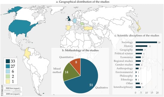 (a) Country distribution, (b) methodologies of the studies, and (c) scientific disciplines. Source: Own depiction, global map from d-maps [48].
