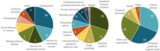 In total, 15 out of 50 (30%) studies reported a change in the gendered division of labour, making it the most prominent effect at the household level. Some studies on households in former coal communities in the UK reported that the new employment situation changed the division of labour, as men started to spend more time at home and women went out to work. As one study put it, “research suggest[s] subtle changes regarding the intersection of class and gender regimes in households that shape this former coalfield. […] there was growing intolerance of men doing nothing in the way of childcare and housework” [61] (p. 1296). Four studies reported a general liberalisation of gender roles [39,49,58,79]. In another study on the coal transition in the USA, it was said, “Men can no longer be the sole breadwinners and, because of declining birth rates, increasing access to education, and modern conveniences, women are less tied to the home. […] They [the women] can attempt to renegotiate a new ‘gender contract’ or leave the relationship all together.” [39] (pp. 1055–1057). However, there is no clear pattern, as other studies also looking at the UK and the USA argued that the patriarchal gender division remained largely the same during and after the transition, often leaving the domestic work to women in addition to their paid jobs [63,73]. Various studies stated that the total workload for women increased, as their domestic tasks remained, but a new responsibility as wage earner was added [73,80,81]. In these cases, domestic tasks did not seem to have decreased substantially, as men started to be unemployed. Williams noted, “if a man did help out around the house, his assistance was given ‘behind closed doors’ and ‘covertly in order to avoid embarrassment, and what might be interpreted as an affront to his manhood’” [81] (p. 69).