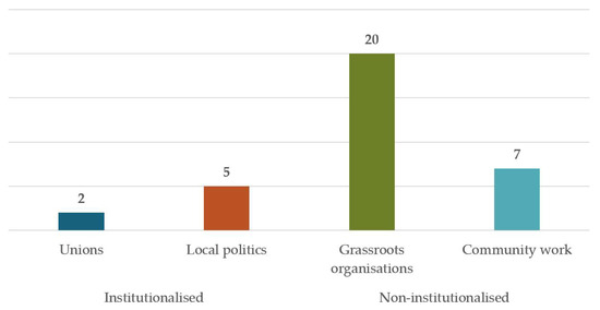 Figure 9 summarises our findings regarding the political spheres of female agency in coal transition processes and reflects the fact that due to a lack of access to institutions and therefore structural power, women have mostly organised themselves informally in grassroots movements and community work [37,53,83]. In the UK, for example, barriers to access to the institutionalised power of the NUM were high; women were not allowed to participate in union meetings. Four years after the beginning of the strike, in 1987, some women were eventually granted associate membership—without voting rights. Most women’s connection to the NUM was therefore based on family ties [53]. Beckwith argued that women’s “indirect movement location [not being directly part of the NUM] also facilitated their activism” [50] (p. 1050). Members of the NUM were threatened with punishment, such as dismissal without compensation, while the women could mobilise and voice their opinion freely and thereby shape the anti-pit-closure discourse. Similar forms of organisation arose in the support of coal strikes in Spain and the USA [43,62]. The activism against MRT in the USA, mostly led by women, can also be considered grassroots work. It is to be noted that Coal River Mountain Watch and other anti-MTR groups were nowhere near as institutionalised and powerful as the UMWA (United Mine Workers of America)—even in its weakening state—particularly concerning the union’s standing in formal institutions such as the government [56]. The forms of protest women chose varied widely, from more traditionally gendered tasks such as community kitchens, to non-violent protests, and even some accounts of violent protests. Moreover, some women engaged in local politics to pursue their interests and “create the conditions and policies that meet their multiple, yet overlapping, aspirations and responsibilities” [39] (p. 1060) or chose this form of organisation after the initial protests against mine closures were over [72].