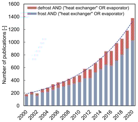 The number of research papers with terms related to ‘‘frost” or “defrost,” and ‘‘heat exchanger” or ‘‘evaporator” published in engineering journals for the last two decades (www.sciencedirect.com, 23 January 2021).