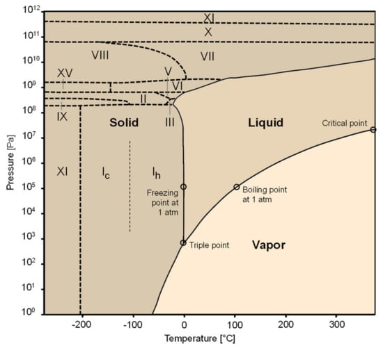 Ice is water in the solid-state. As shown in Figure 2, depending on the thermodynamic condition (temperature and pressure), fifteen different forms of ice can be observed [7]. On the other hand, frost is a porous medium comprised of ice crystals and moist air formed due to a very particular set of surface and psychrometric conditions. As depicted in Figure 3, when moist air flows over a chilled surface, either condensation or freezing may occur. If the surface temperature is below the dewpoint of the moist air and above the water freezing point, moisture condensation may occur. However, if the surface temperature is below the dewpoint and below the freezing point, the water vapor may condense and freeze. Nevertheless, if both the surface temperature and the dewpoint are below the freezing point, vapor desublimation into solid may take place. The latter is the most likely condition for the accretion of a frost layer, being attained at the solid-vapor boundary below the triple point, as illustrated in Figure 2.
