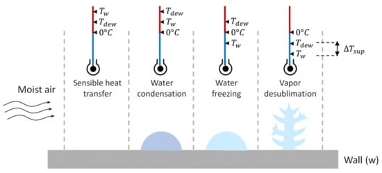 Phase transition of water for different psychrometric and surface conditions.