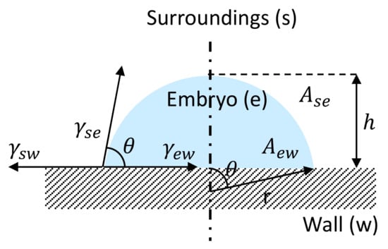 Nucleation is initiated when the amount of energy removed from an embryo, i.e., a cluster of water molecules, is high enough to surpass a certain energy barrier related to the supercooled/supersaturated metastable states of Figure 4. Nucleation is called homogeneous when the phase change occurs with no contact with solid boundaries, or heterogeneous when there is an interface between the vapor and a substrate (a typical condition of refrigerator evaporators), as shown in Figure 5. A hemispherical shape of radius r is considered as the cluster tends towards a state of minimum energy, seeking the smallest surface area for a given volume. On the one hand, energy must be removed to promote the phase change of the volume (which follows the r3 scale) while, on the other hand, energy is required to form a new interface. In Figure 5, Ase and γse represent the surrounding-embryo interface area and the embryo surface energy, respectively, whereas γew and γsw stand for the surface energies at the embryo-wall and surrounding-wall interfaces, respectively, and Aew is the embryo-wall interface area. An energy balance at the embryo surface provides the net energy barrier required to form a new interface, yielding γse Ase − (γsw − γew) Aew (which follows the r2 scale). Therefore, an optimum embryo size (i.e., radius) must exist that minimizes the energy barrier. Piucco et al. [8] expressed the minimum energy barrier for the onset of nucleation as a function of the supersaturation degree and surface static contact angle, θ = cos−1(γsw − γew)/γse, yielding,